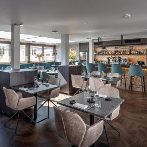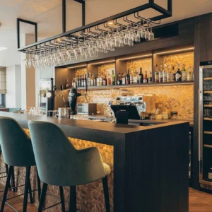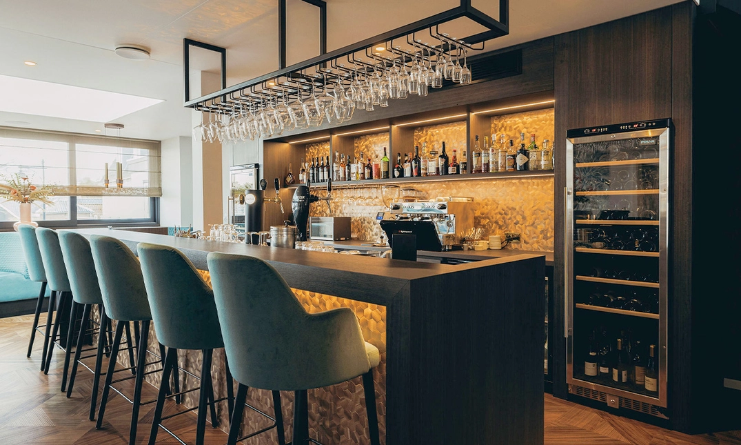 Totale inrichting met meubels, banken, stoelen & tafels en maatwerk bar en bar achterwand met LED verlichting.